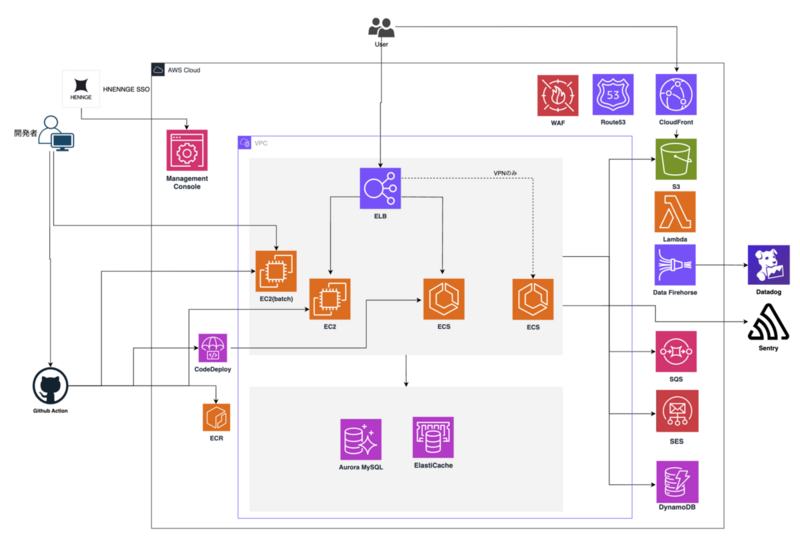 アプリケーションはコンテナ化しており、ALB+ECS+RDSを中心とした一般的なWebアプリ構成です。スケーラビリティと柔軟性を維持して、開発者が素早く新機能をリリースできる環境を構築しています。