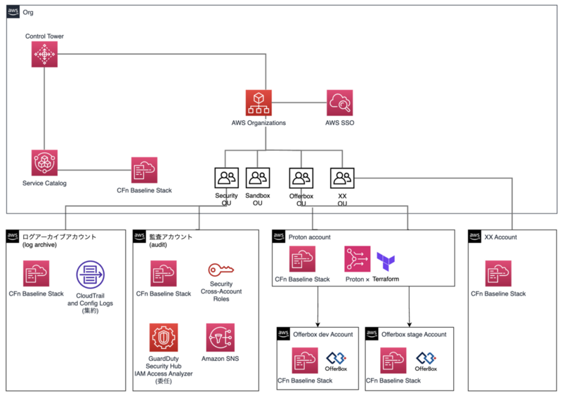OfferBoxに関連するAWS環境は少し前にマルチアカウント構成へと変更しました。AWS Control TowerとAWS Organizationを使用して、アカウント管理を行っています。